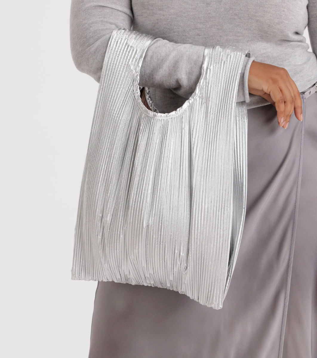 A special, pleated version of our classic Baby Baggu shape that can be worn as a dressier, fashion forward catch-all bag.