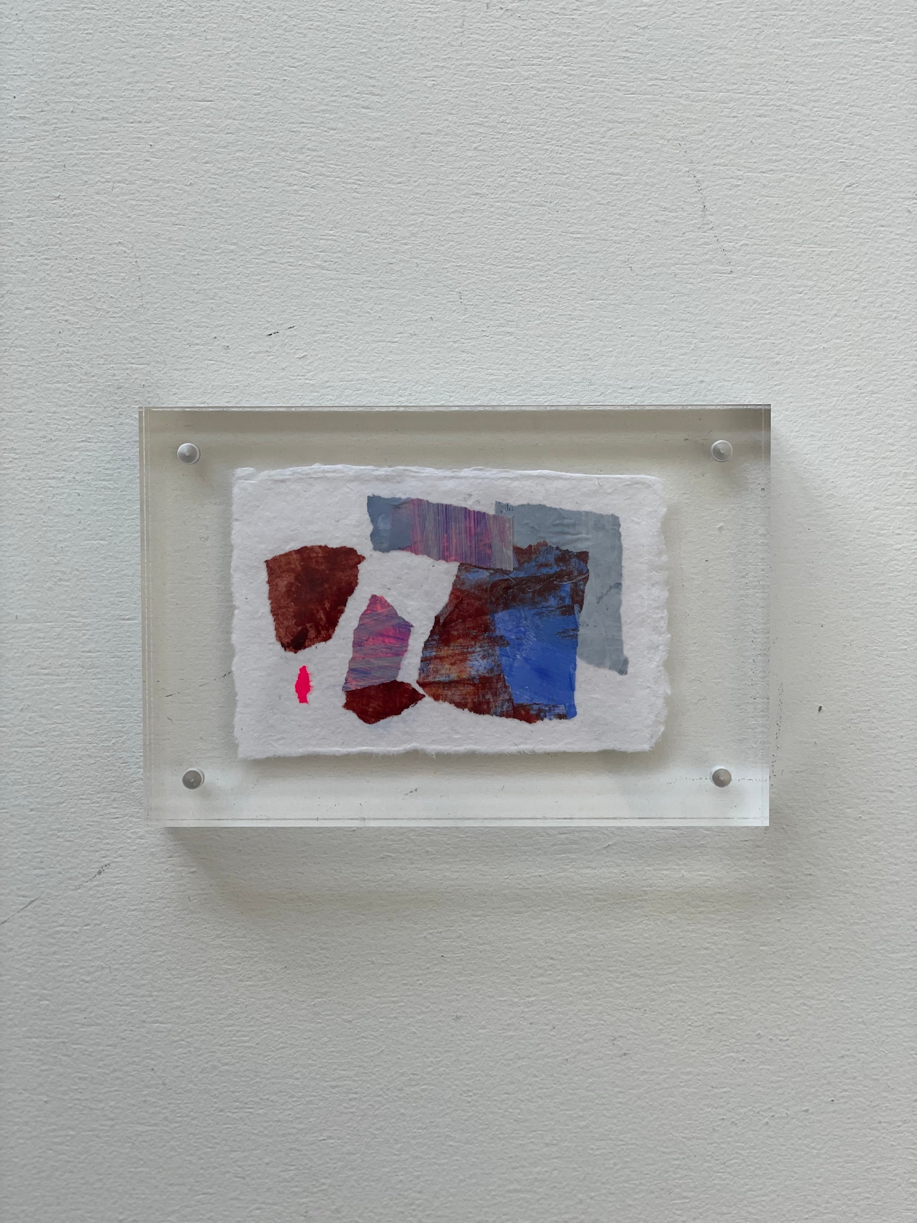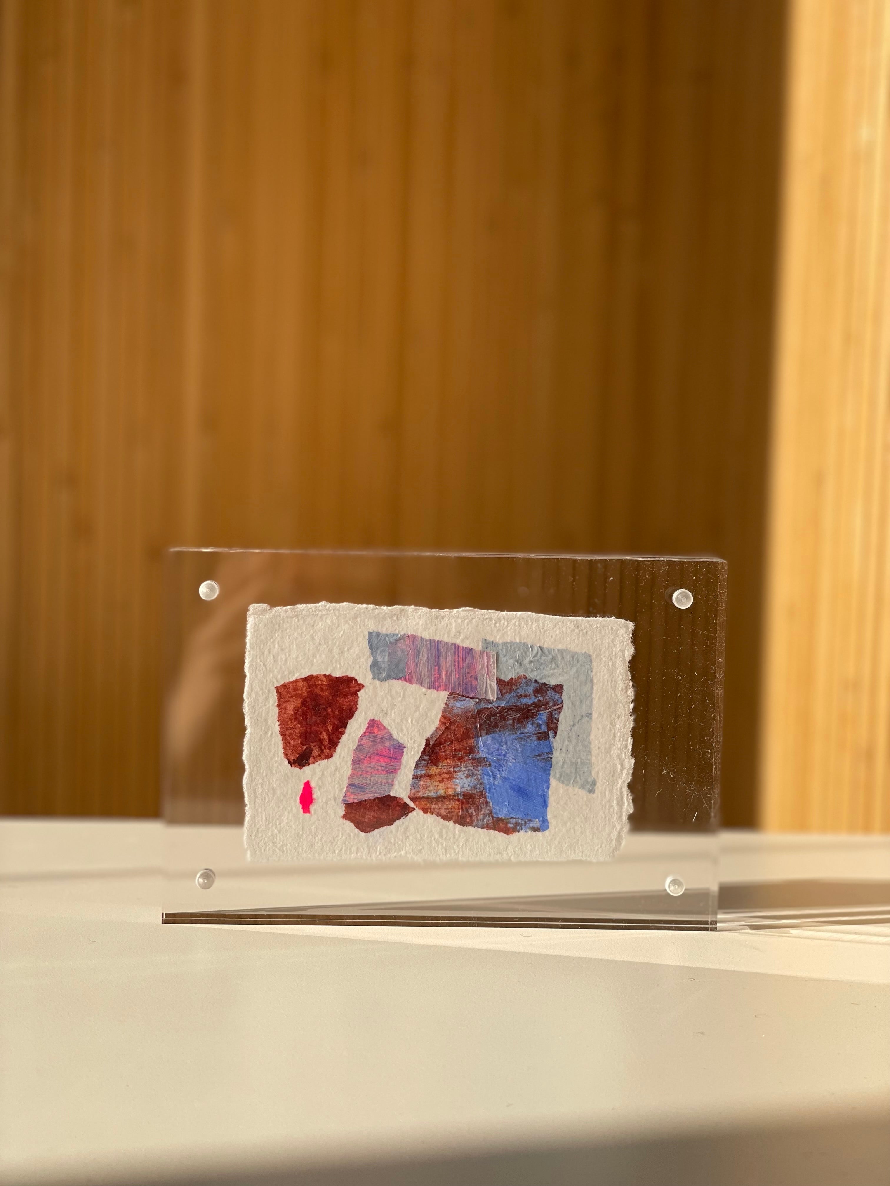 Original art 4x6 mixed media collage on handmade cotton paper in acrylic frame by Ashley Cordes.