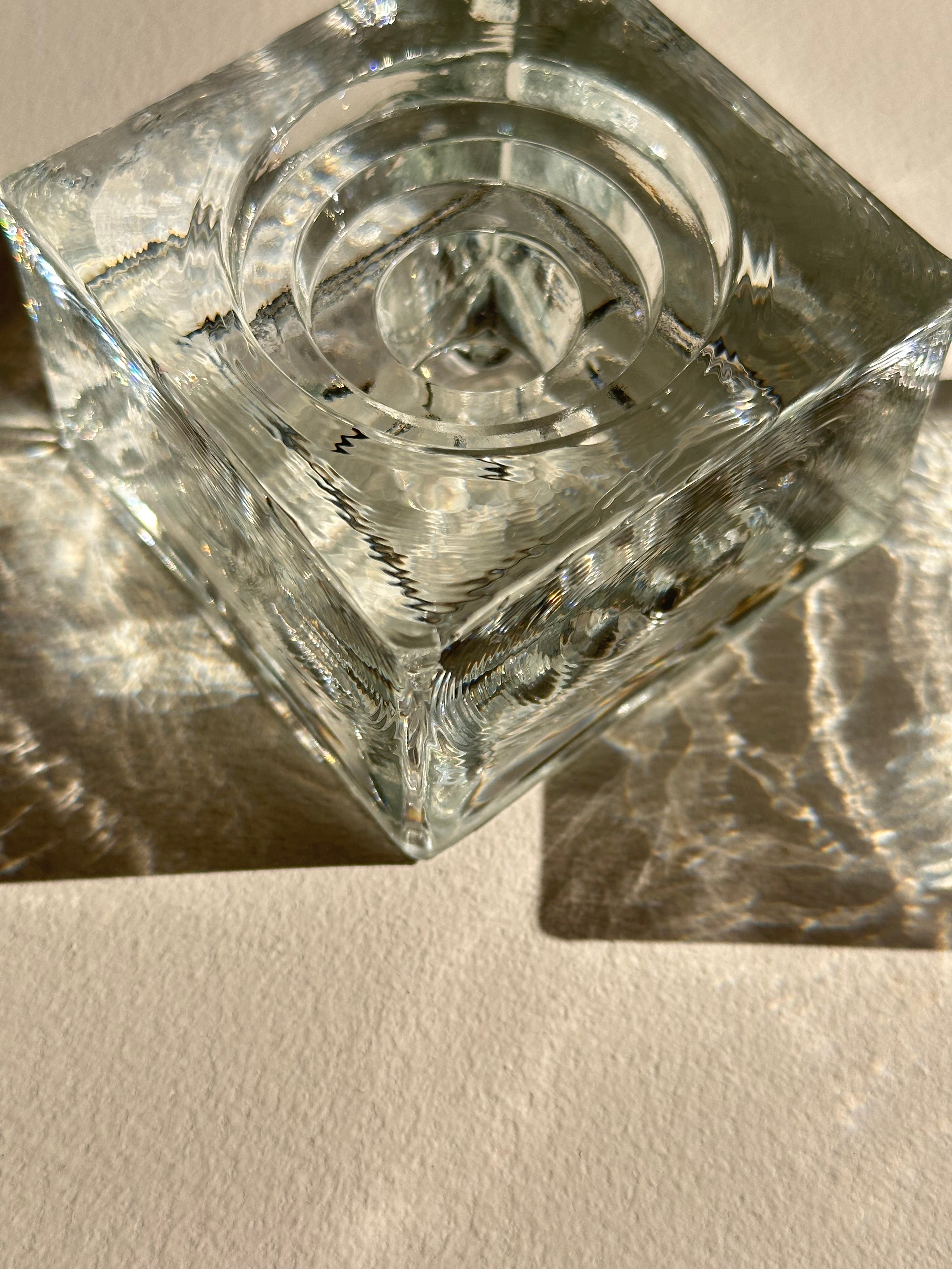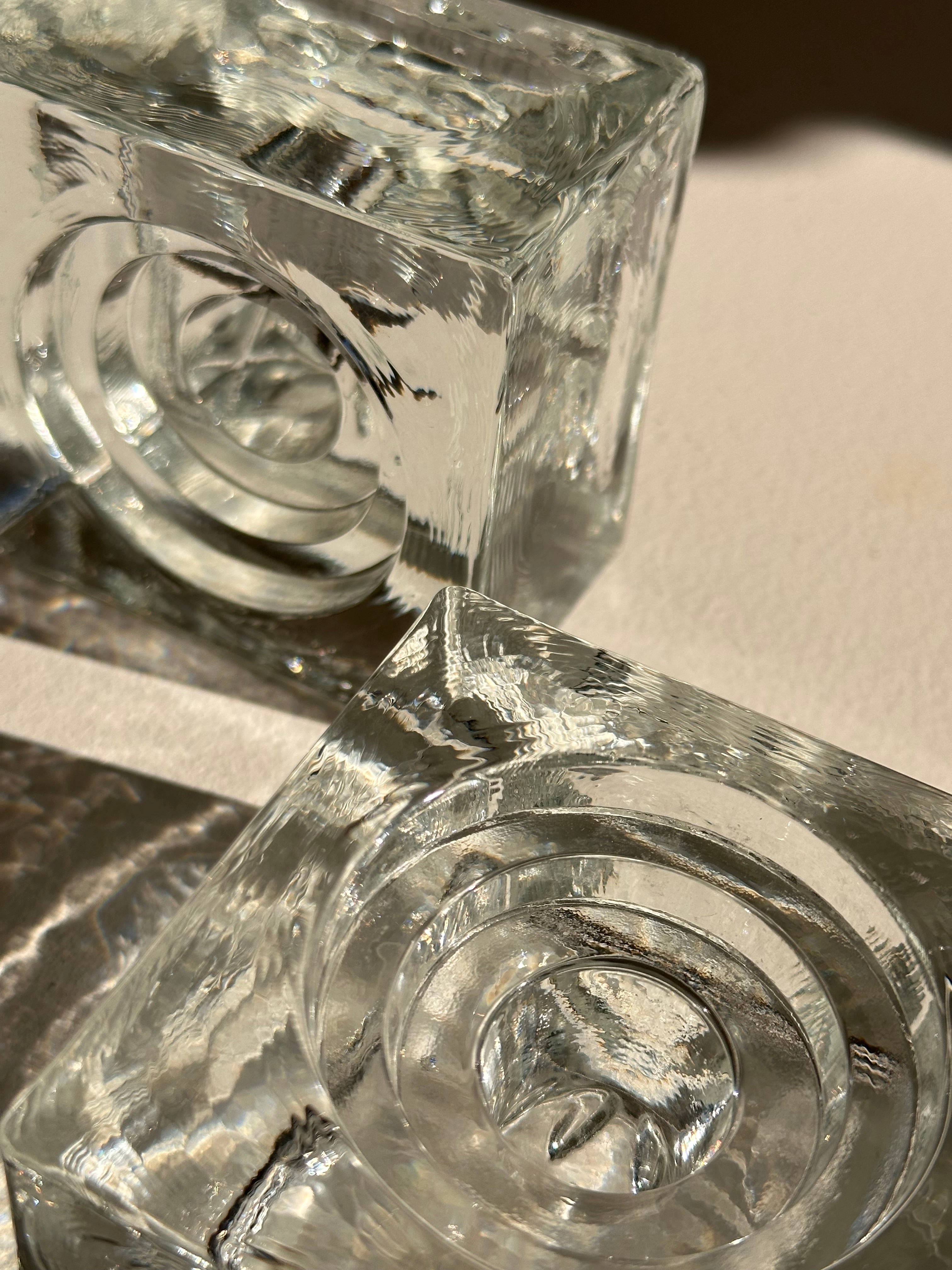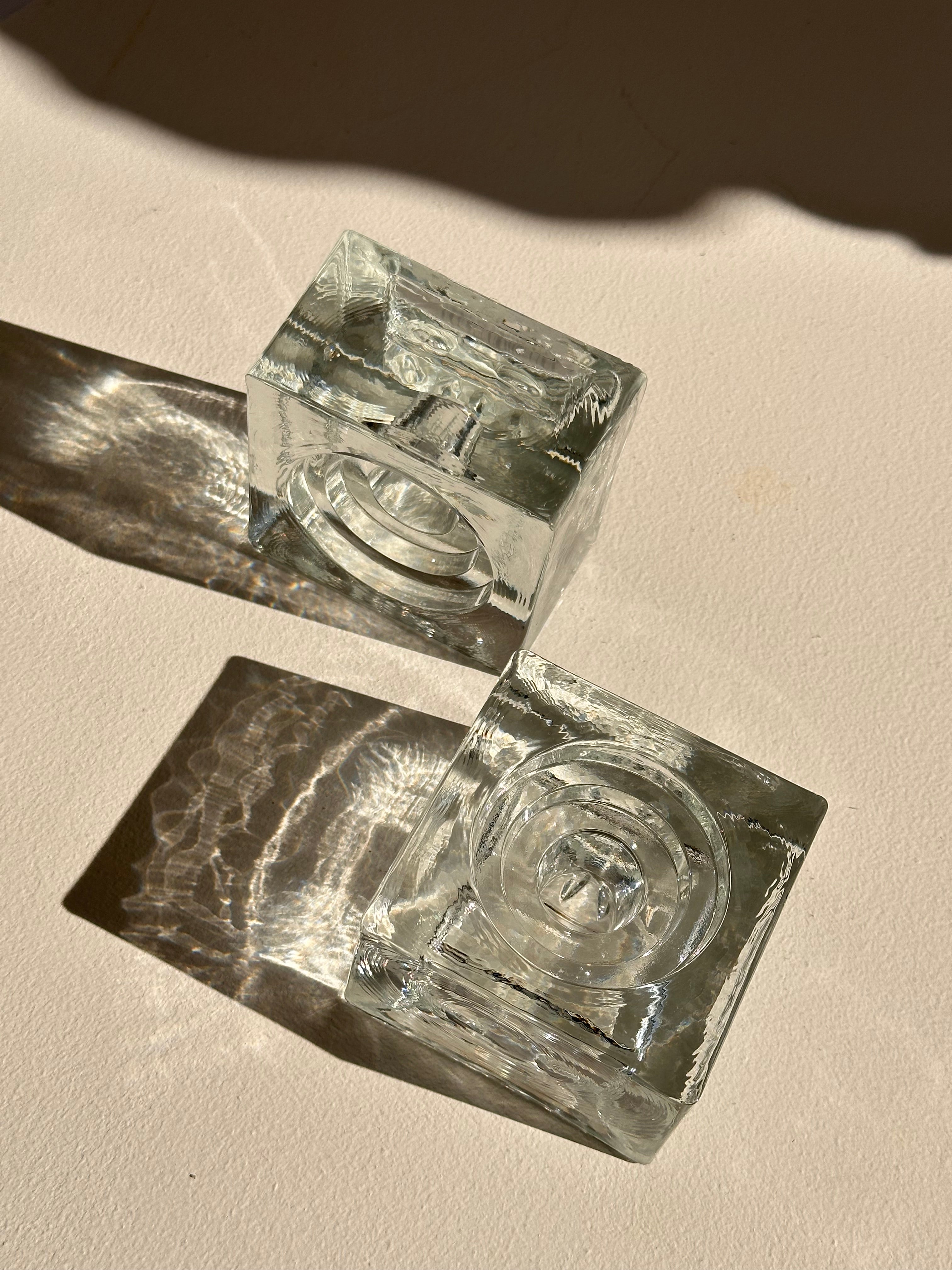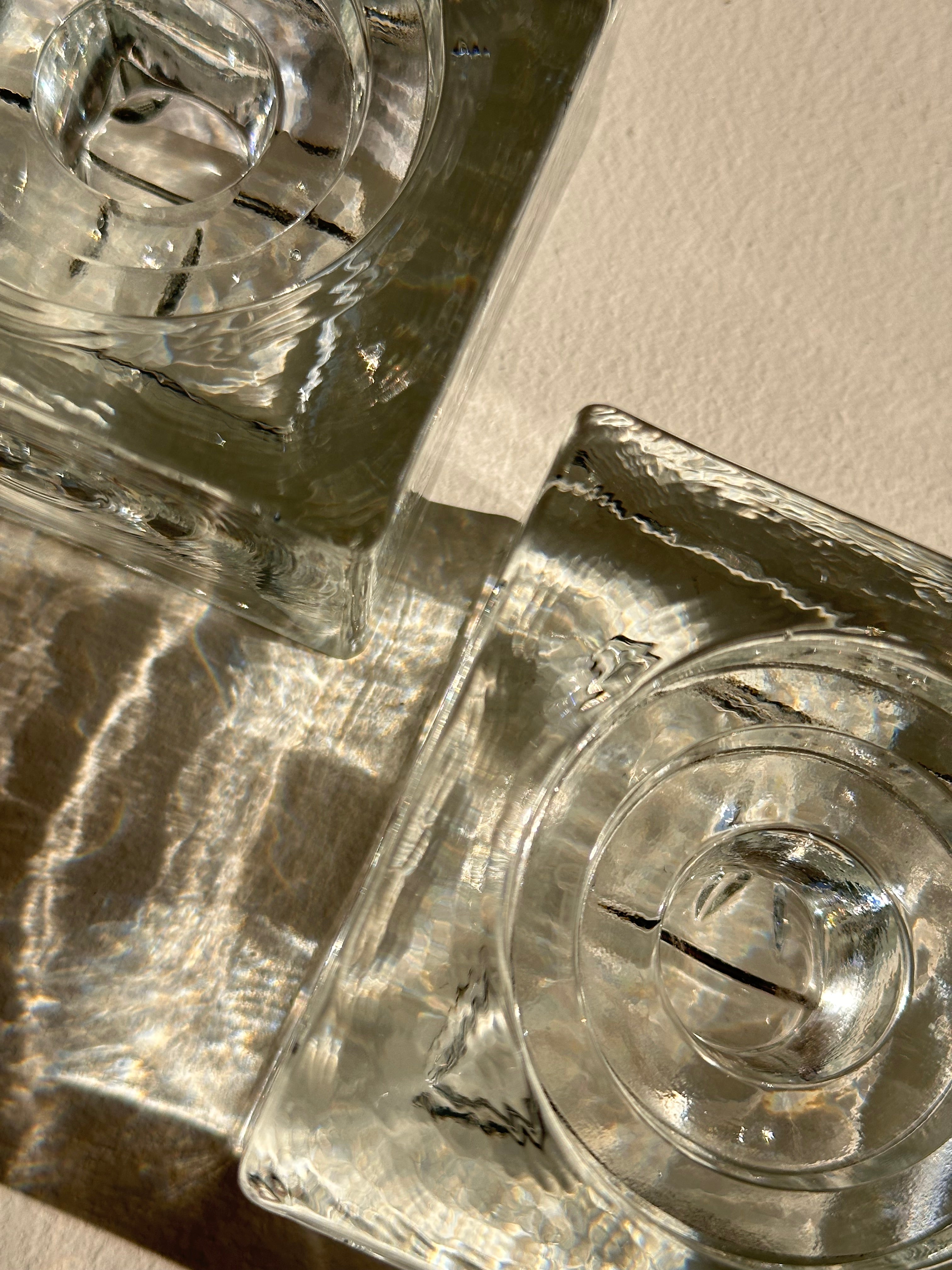 Mid-century modern vintage glass candle holders, perfect for your dining table or console. Imagine these pieces surrounded by neutral linens, ceramic vases or wooden textures to balance the sleek glass. Has a rippled texture, which reflects the sun like water.